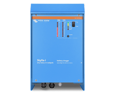 Une sortie de puissance nominale et une sortie de 4 A. La tension de charge peut être ajustée avec précision pour s’adapter à n’importe quel système de batteries. L’entrée pour le chargeur est de 230 V à 50/60 HZ. La tension de charge peut être mesurée directement sur les bornes de la batterie afin de compenser la perte de tension due à la résistance des câbles. Une sonde externe permet de mesurer la température de la batterie et d’adapter la tension de charge en conséquence.